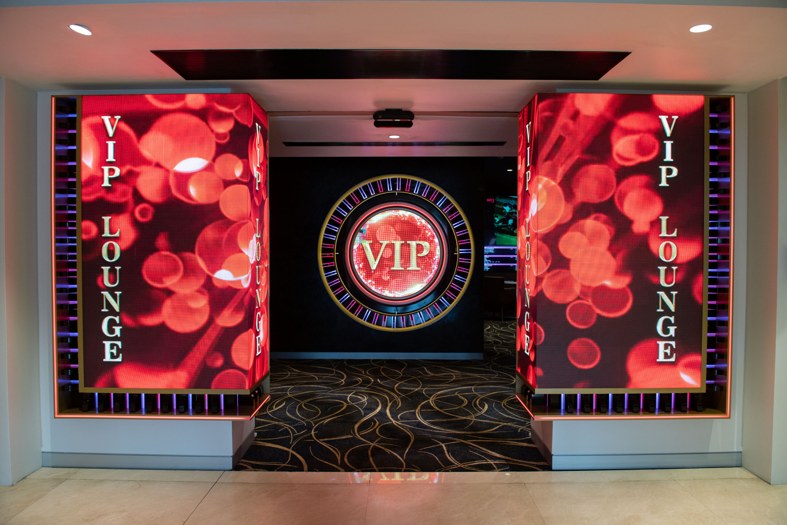 The final displays reflect the modular and adaptable nature of the LED technology, presenting striking shapes and forms that compliment and enrich the install locations. Custom animations and programmable lighting trims group the displays and make for an exciting entrance to the gaming floor.