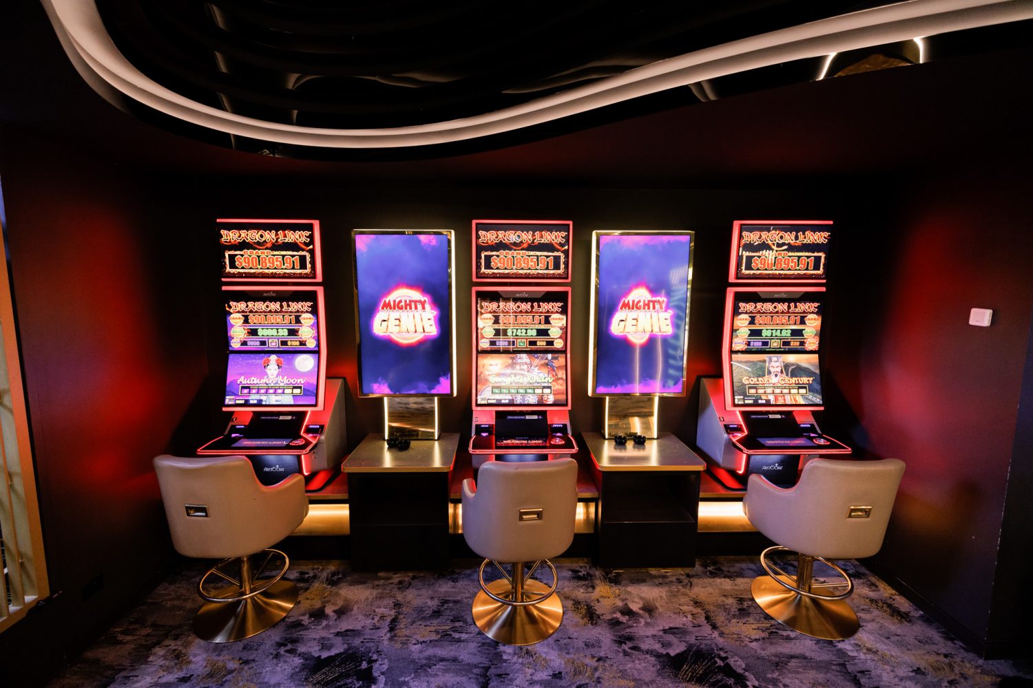At the heart of the venue is a striking entry feature—a massive LED display with seamless curved ends, housed within decorative cabinetry. This centrepiece sets the tone for the curved display installations seen throughout the gaming room.