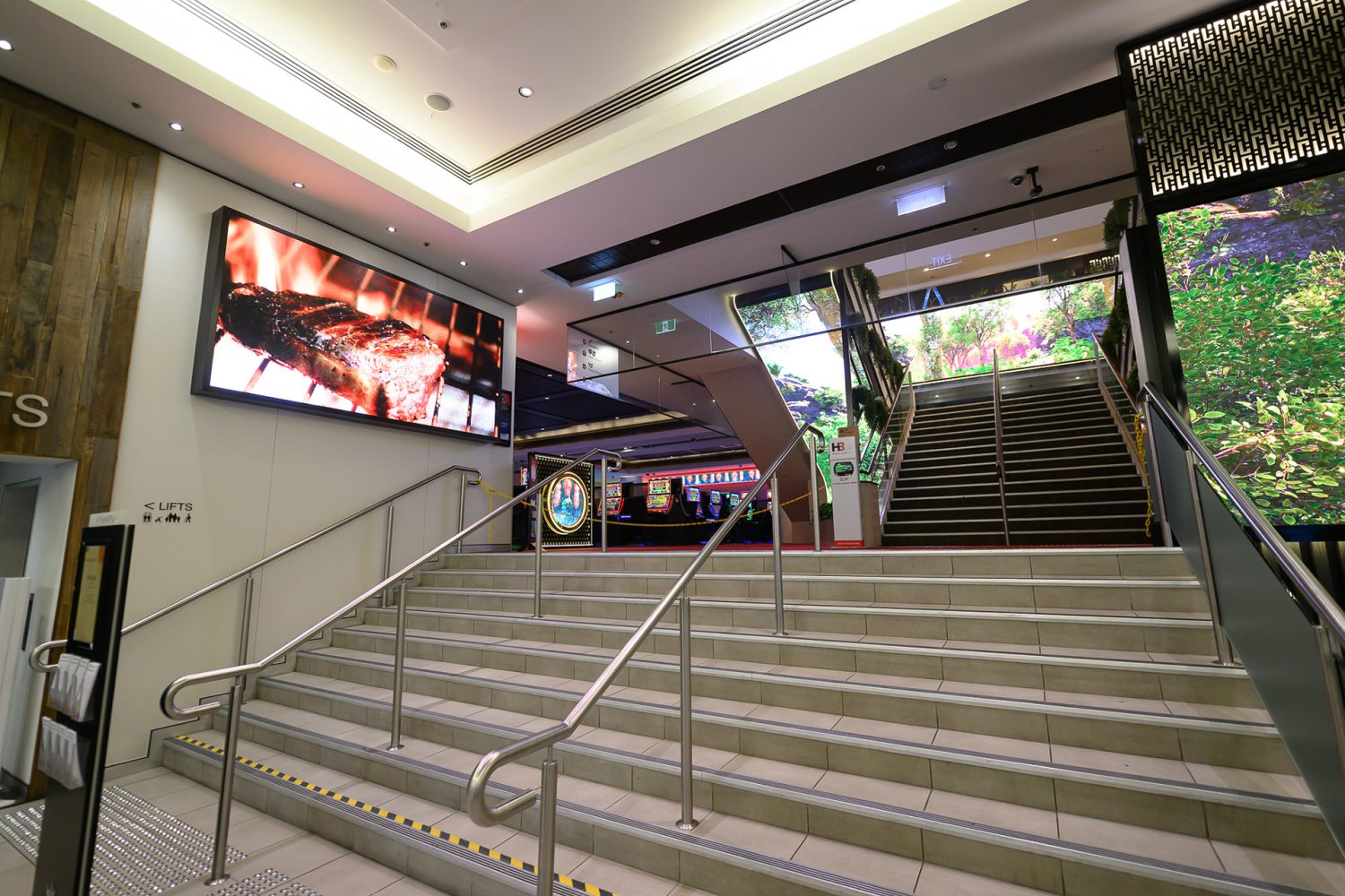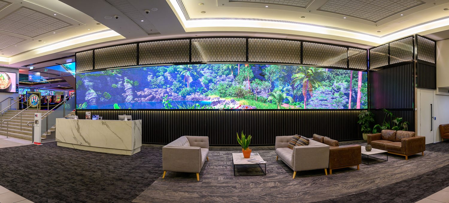 An in house mystery link and foyer theme custom graphics were developed by Precision Signs’ in house Animation Studio. The foyer and escalator displays are synchronised boast peaceful jungle and dazzling space themed animations.