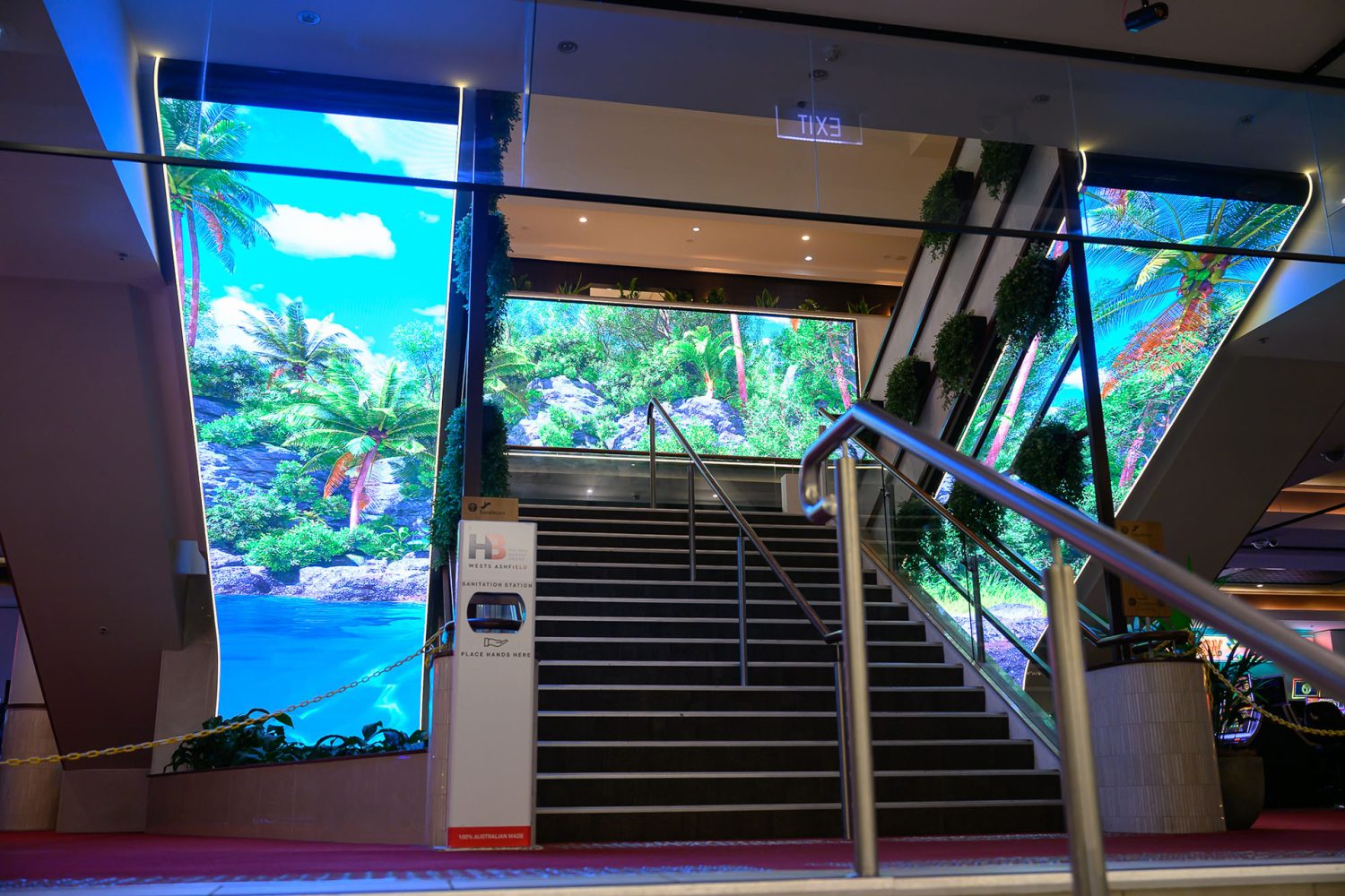 This project features multiple technologies in various areas of the venue. Transparent, Flex and Glue on Board LED displays deliver content throughout the building.