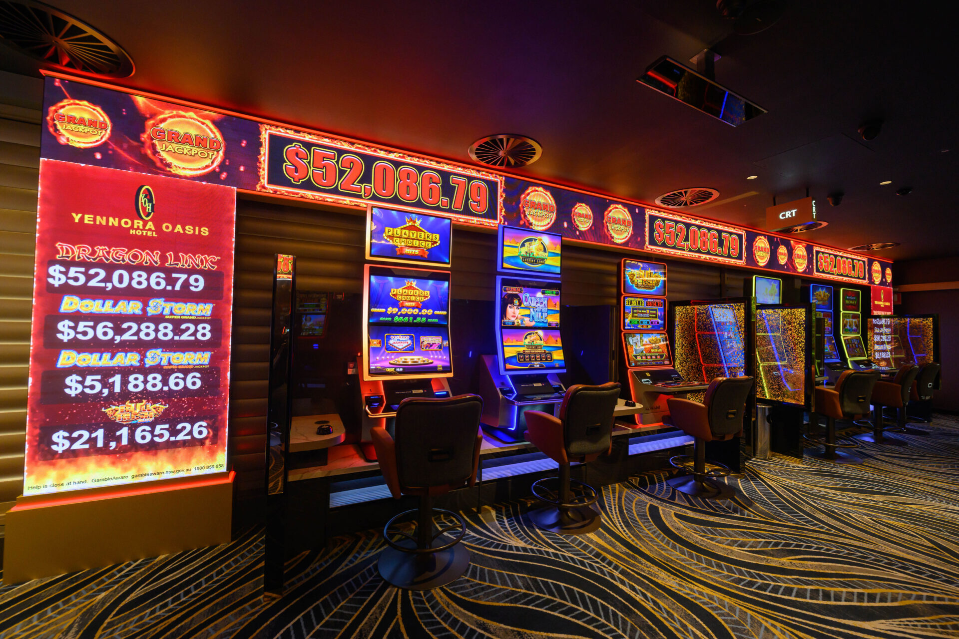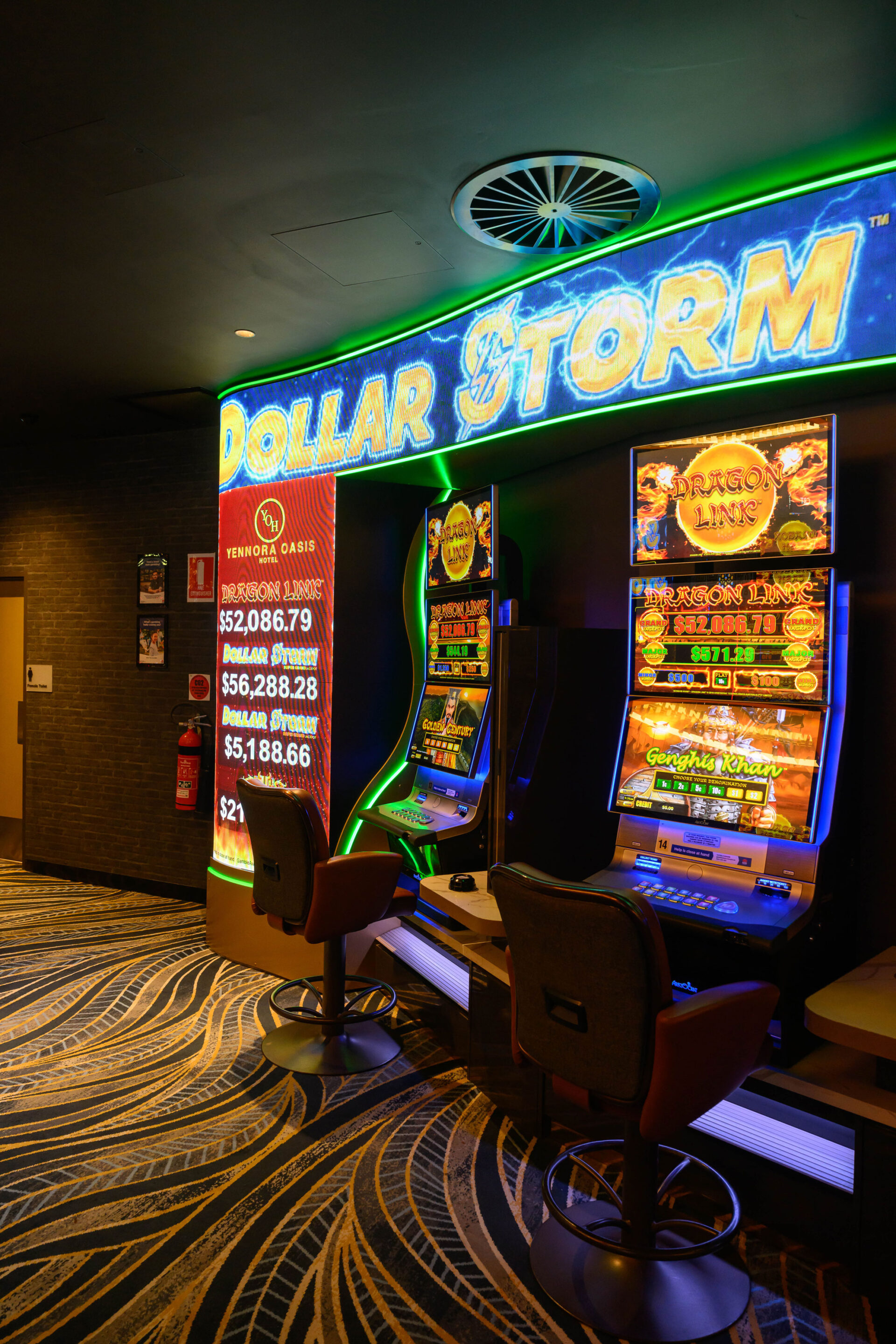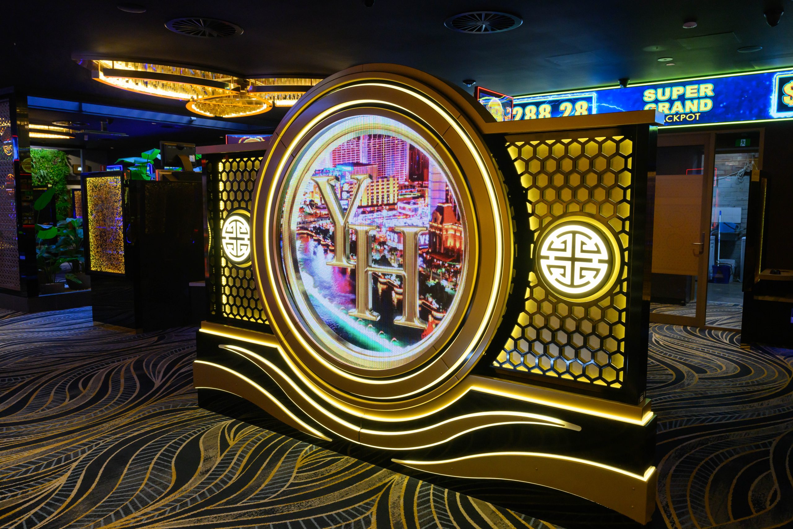 The room features an eye catching Circular LED entry Display and 2 custom LED displays that surround key gaming banks in the venue.